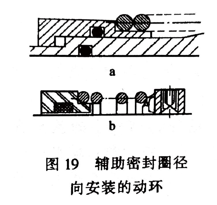 輔助密封圈徑向裝置的動環(圖19),靠密封圈的過盈和彈性實現密封,其材質大多采用聚四氟乙烯和合成橡膠。伴隨使用時間變長,這兩種材質分別呈現冷流變形和老化而失去彈性。有文獻記載,這種結構的密封,有40%的失效發生在輔助密封圈位置。