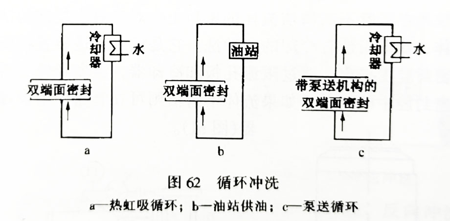 循環沖洗是經過一個泵送裝置使外加的密封流體進行循環(圖62)。這里有兩點需要引起留意,一是“泵送裝置”,可以是外加的油站和密封腔形成閉合回路進行循環,也可在密封腔中裝設一個泵,或者是用熱虹吸的原理使流體循環。另一點要留意的是“外加的密封流體”。這種沖洗方法用在雙端面或多端面密封上,在單端面密封上不選用。循環沖洗也有人稱為“外循環”。