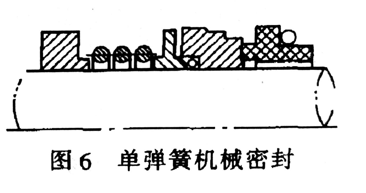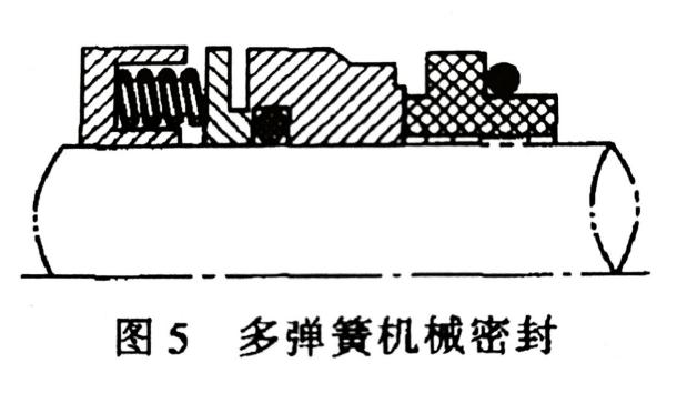按補償結構中彈簧的數量可分為多彈簧和單彈簧機械密封。補償結構中有多個彈簧的密封稱為多彈簧機械密封(圖5);補償結構中只有一個彈簧的機械密封稱為單彈簧機械密封(圖6)。多彈簧機械密封又稱小彈簧機械密封,這種結構軸向長度較小,可用更改彈簧數量的辦法調節彈性力大小,軸向力較均勻,適用于高速機械密封,在腐蝕性介質中不宜采用。單彈簧機械密封又稱大彈簧機械密封,密封結構較為簡單。有的密封型式還用彈簧傳遞扭矩。國產密封應用大彈簧較多,但不能用于高速。
