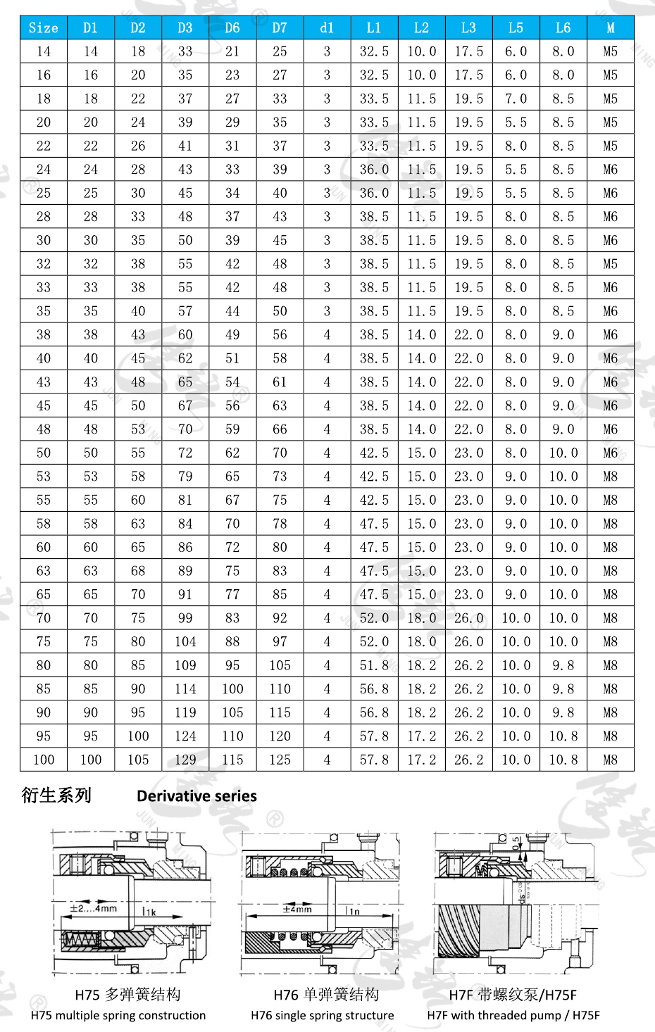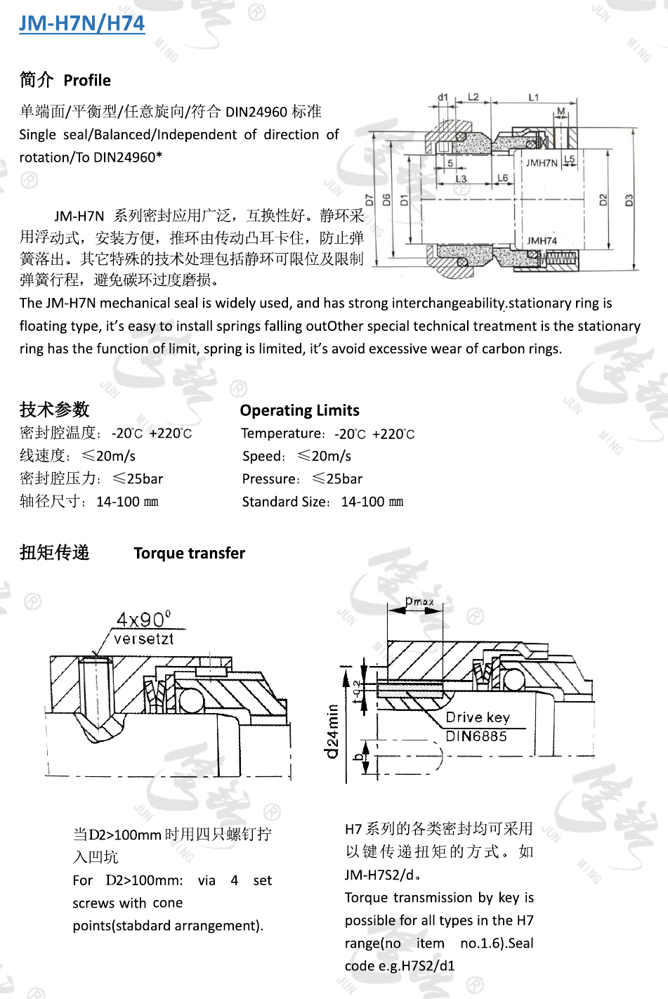 單端面/平衡型/任意旋向/符合DIN24960標準 H7N系列密封應用廣泛,互換性好。靜環采用浮動式,安裝方便,推環由傳動搭子卡住,防止彈簧落出。其它特殊的技術處理包括靜環可限位及限制彈簧行程,避免碳環過度磨損。