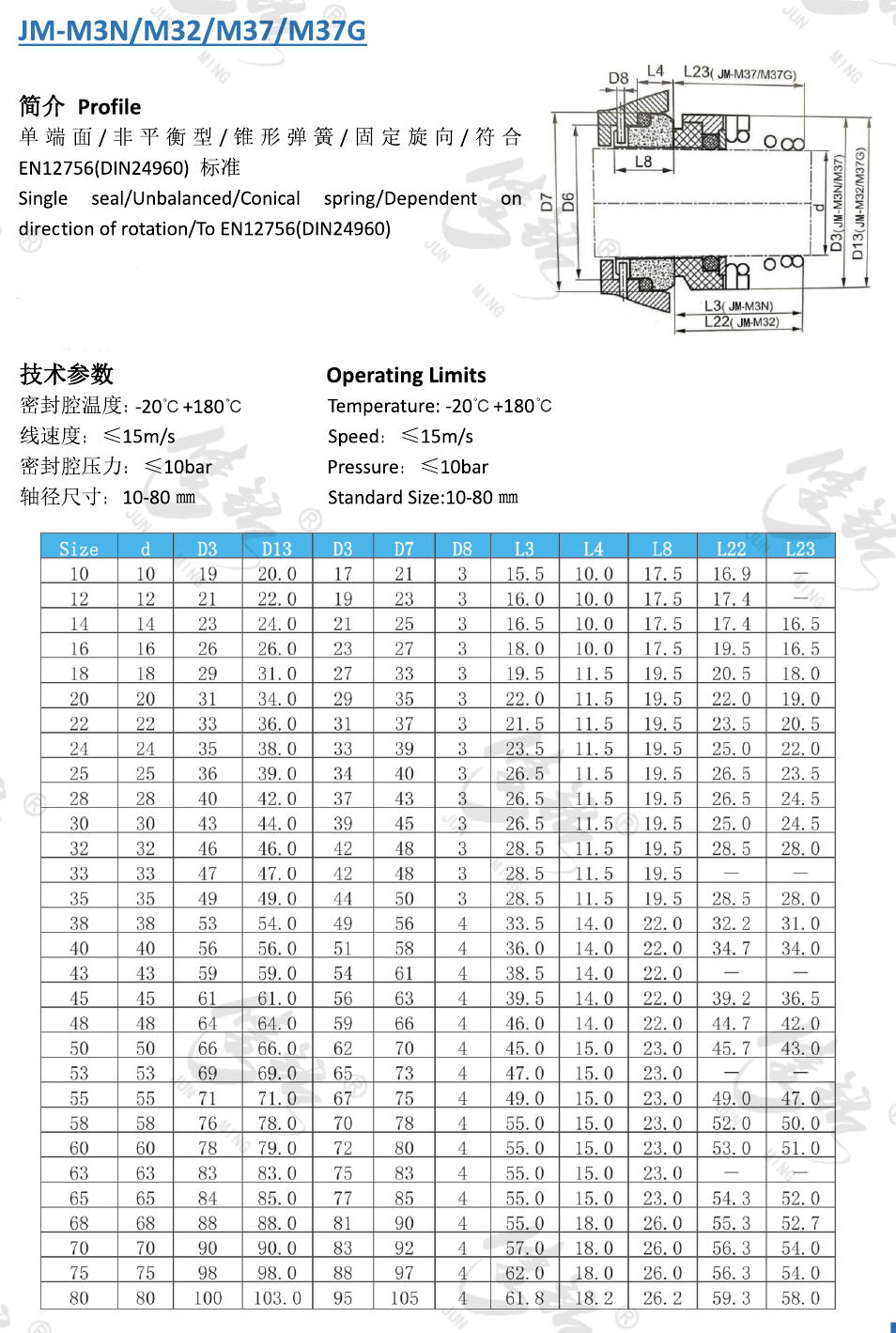 單端面/非平衡型/錐形彈簧/固定旋向/符合EN12756(DIN24960) 標準。 M3N系列的機械密封,結構簡單,應用廣泛,可靠性好。適用于清水泵,污水泵,潛水泵以及化工流程泵等。