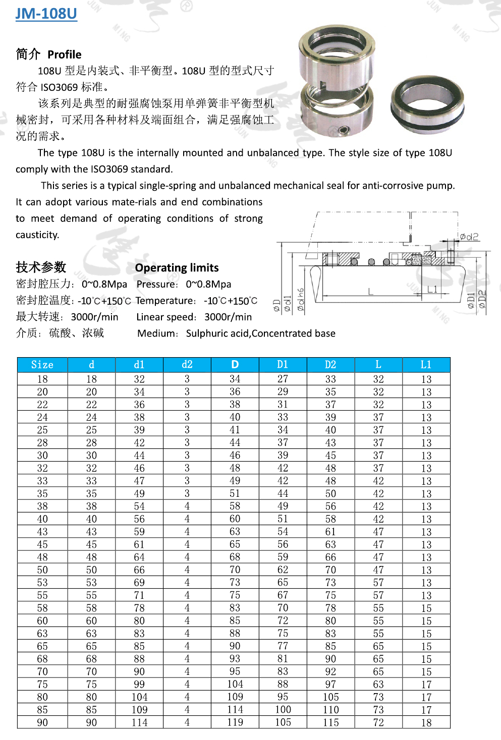 108U型是內裝式、非平衡型。108U型的型式尺寸符合ISO3069標準。 該系列是典型的耐強腐蝕泵用單彈簧非平衡型機械密封,可采用各種材料及端面組合,滿足強腐蝕工況的需求。