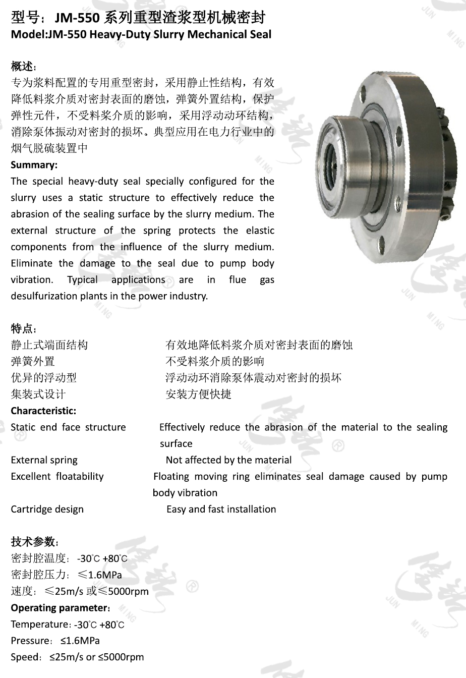 專為漿料配置的專用重型密封,采用靜止性結構,有效降低料漿介質對密封表面的磨蝕,彈簧外置結構,保護彈性元件,不受料槳介質的影響,采用浮動動環結構,消除泵體振動對密封的損壞。典型應用在電力行業中的煙氣脫硫裝置中