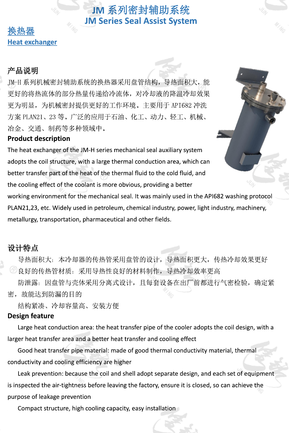 JM-H系列機械密封輔助系統的換熱器采用盤管結構,導熱面積大,能更好的將熱流體的部分熱量傳遞給冷流體,對冷卻液的降溫冷卻效果更為明顯,為機械密封提供更好的工作環境。主要用于API682沖洗方案PLAN21、23等。廣泛的應用于石油、化工、動力、輕工、機械、冶金、交通、制藥等多種領域中。