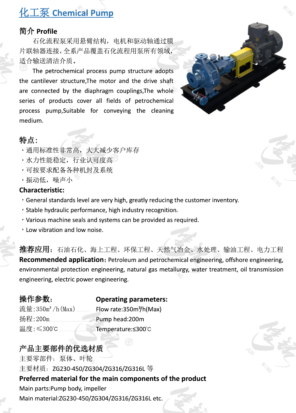石化流程泵采用懸臂結構,電機和驅動軸通過膜片聯(lián)軸器連接,全系產(chǎn)品覆蓋石化流程用泵所有領域,適合輸送清潔介質(zhì)。