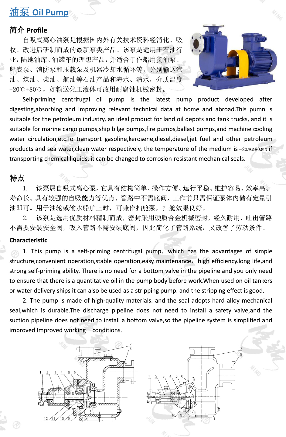 自吸式離心油泵是根據(jù)國內(nèi)外有關(guān)技術(shù)資料經(jīng)消化、吸收、改進(jìn)后研制而成的最新泵類產(chǎn)品。該泵是適用于石油行業(yè),陸地油庫、油罐車的理想產(chǎn)品,并適合于作船用貨油泵、船底泵、消防泵和壓載泵及機(jī)器冷卻水循環(huán)等,分別輸送汽油、煤油、柴油、航油等石油產(chǎn)品和海水、清水,介質(zhì)溫度-20℃+80℃,如輸送化工液體可改用耐腐蝕機(jī)械密封。