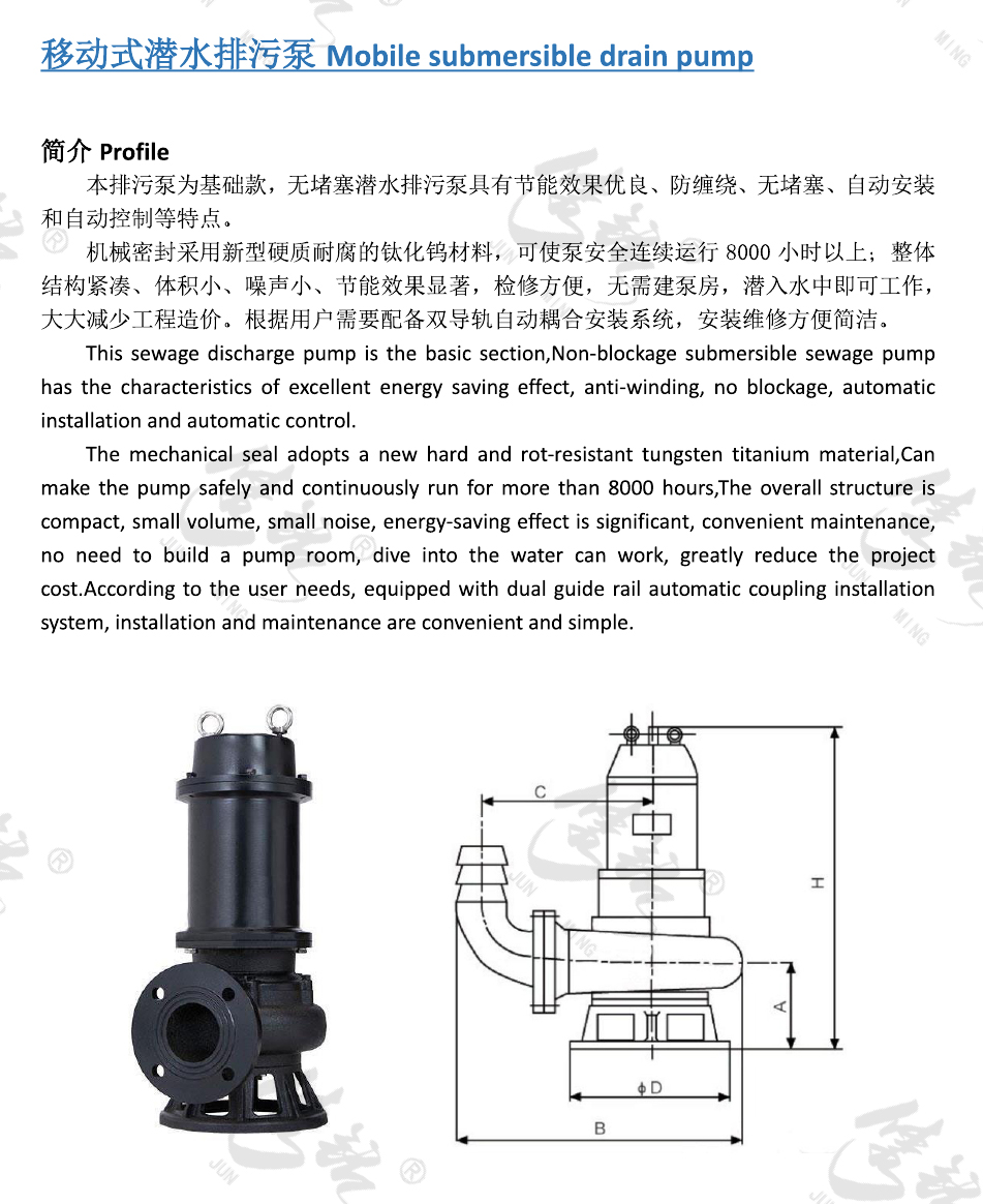 本排污泵為基礎(chǔ)款,無堵塞潛水排污泵具有節(jié)能效果優(yōu)良、防纏繞、無堵塞、自動安裝和自動控制等特點。