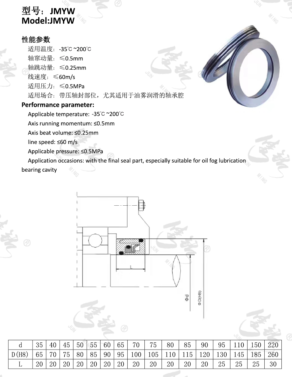 性能參數: ○適用溫度:-35℃~200℃ ○軸竄動量:≤0.5mm ○軸跳動量:≤0.25mm ○線速度:≤60m/s ○適用壓力:≤0.5MPa ○適用場合:帶壓軸封部位,尤其適用于油霧潤滑的軸承腔